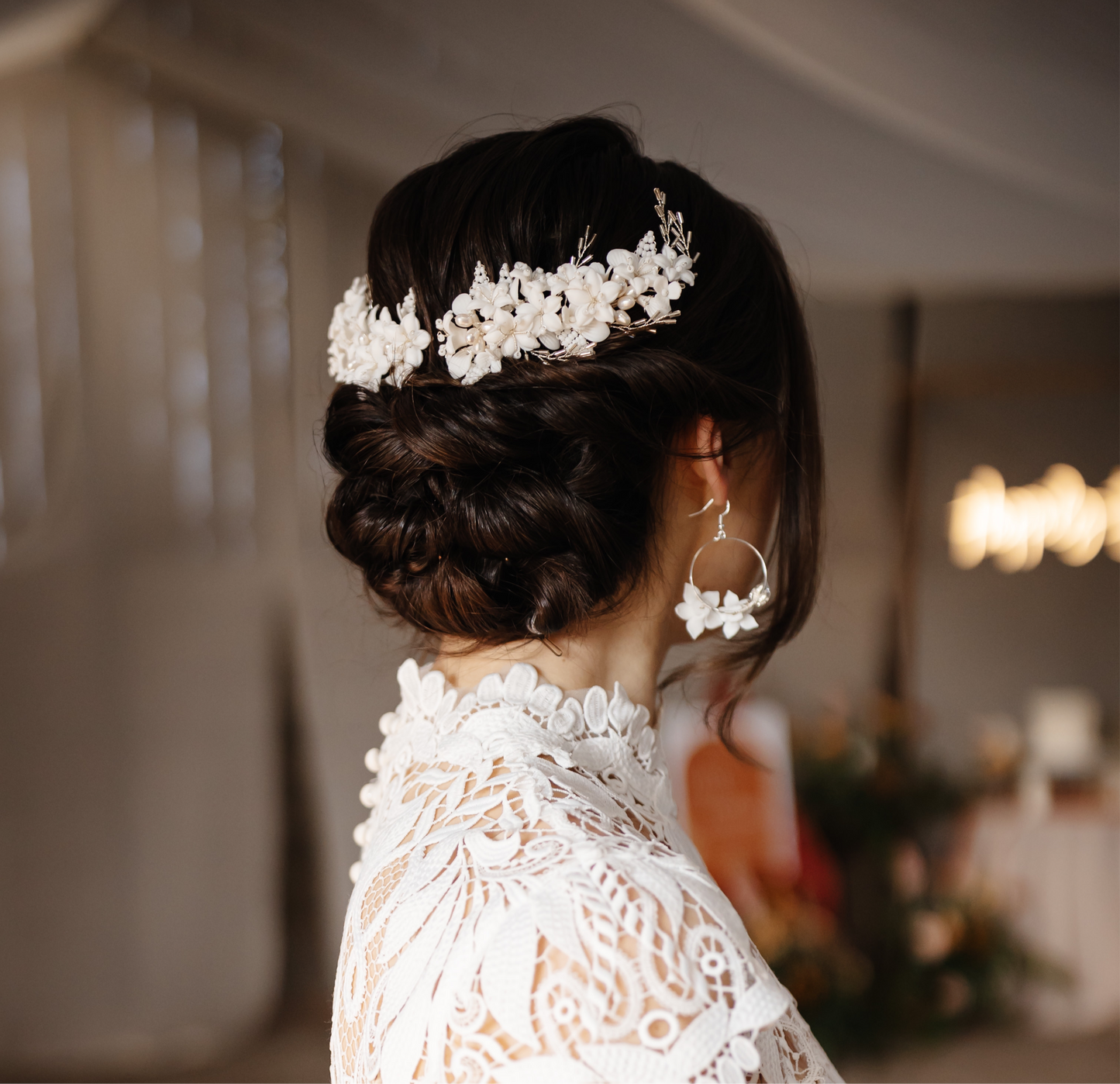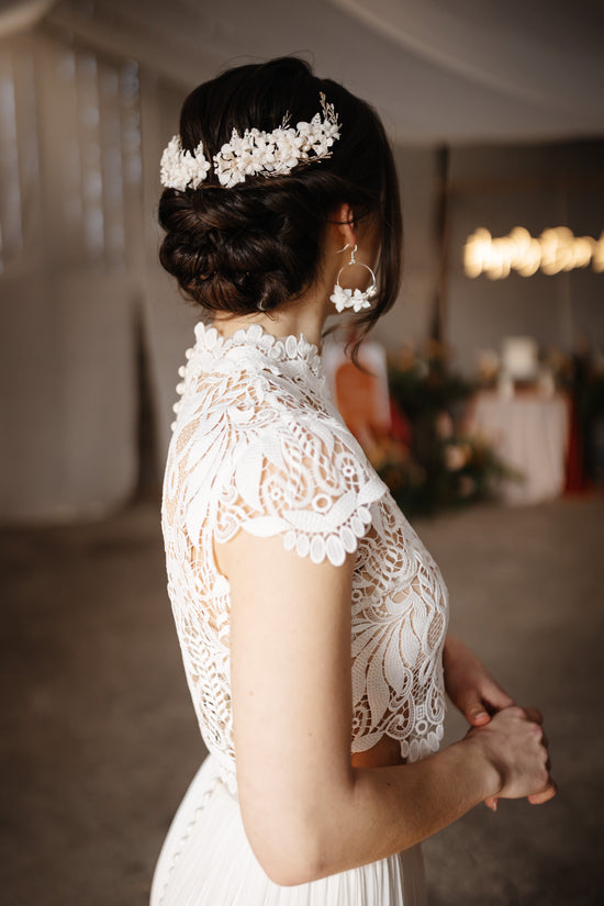 These double combs are made of beautiful clay white flowers and full of beaded and leaf embellishments.